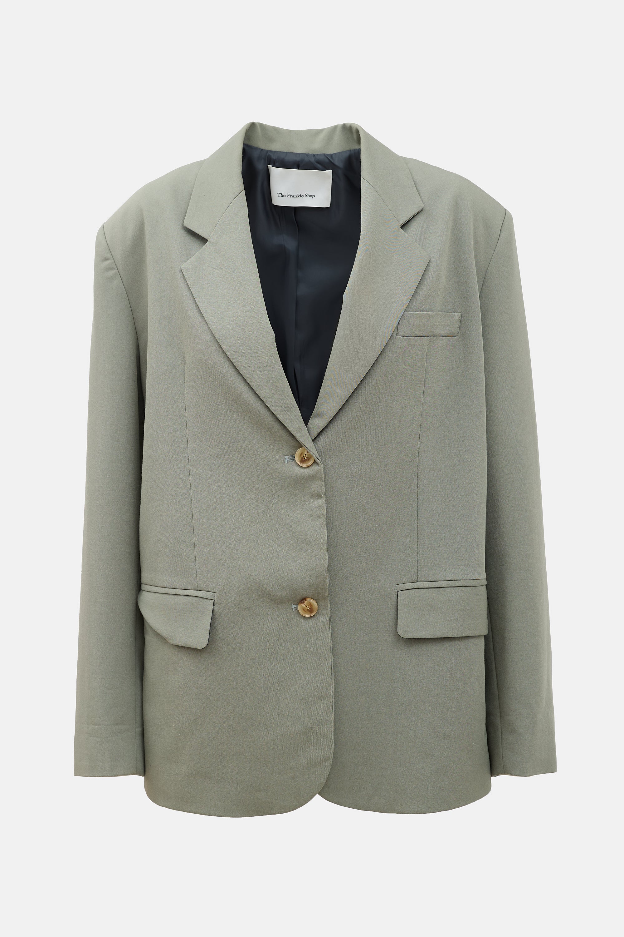 Pre-owned The Frankie Shop green Felola oversized blazer featuring a notched lapel, button front closure, one welt pocket at chest, two flap pockets at hip, vented back, and buttoned cuffs. Lined.