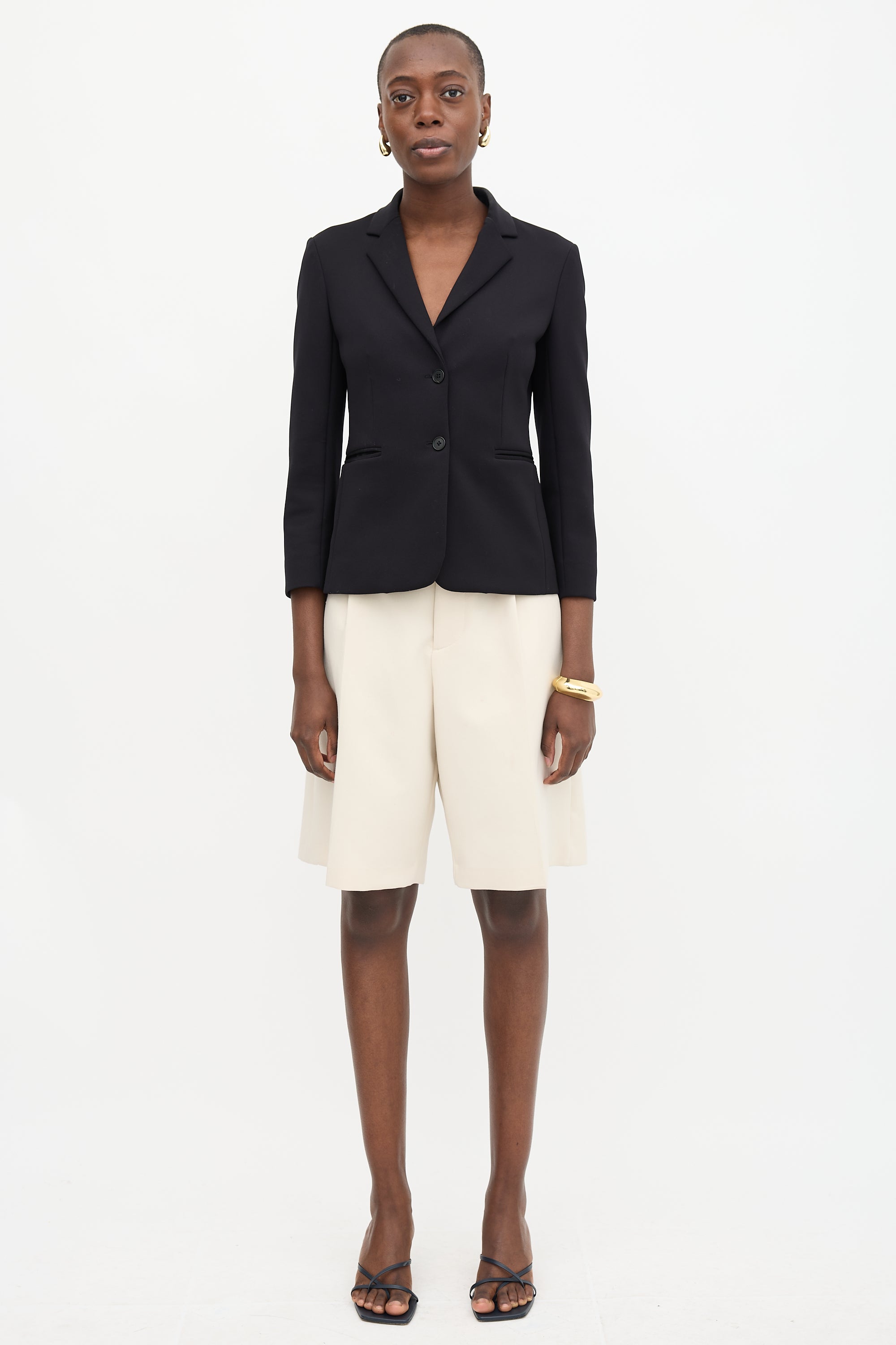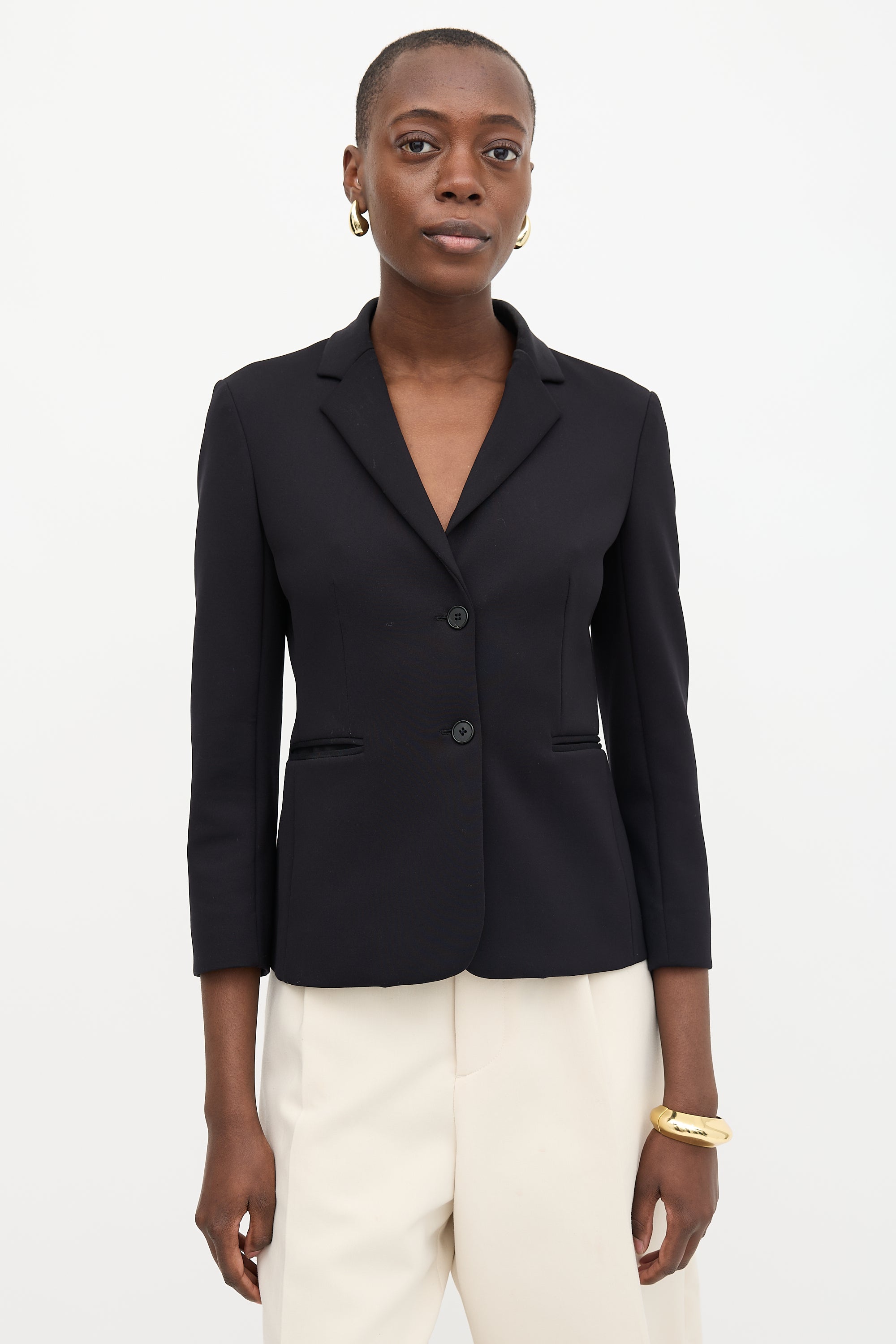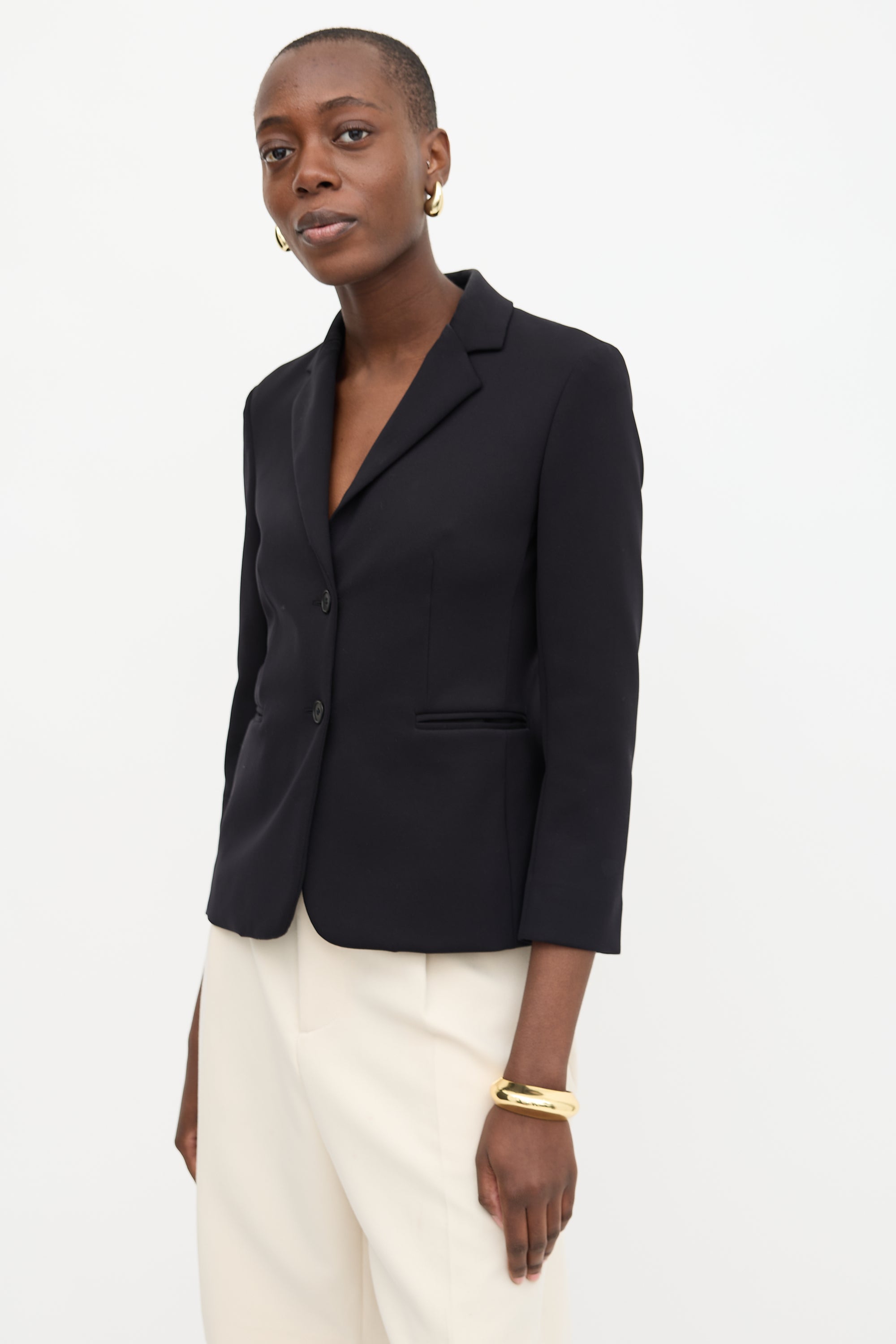 Pre-owned The Row black Brentwood blazer featuring a notched collar, button front, double welt pockets, and back vent. Lined.