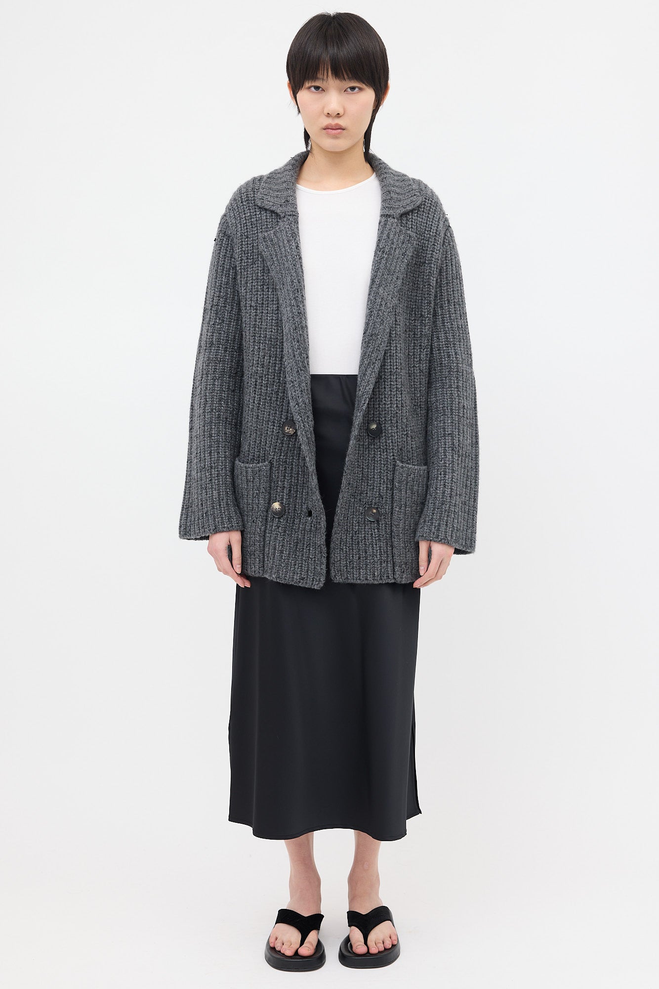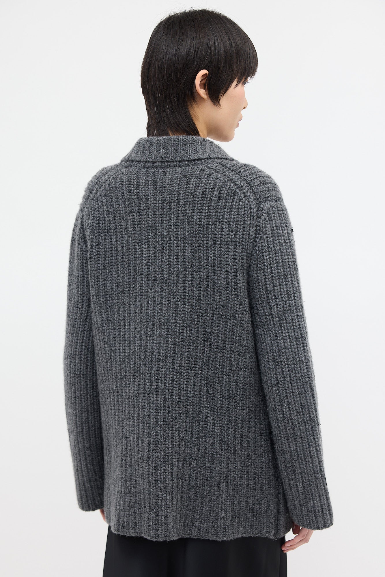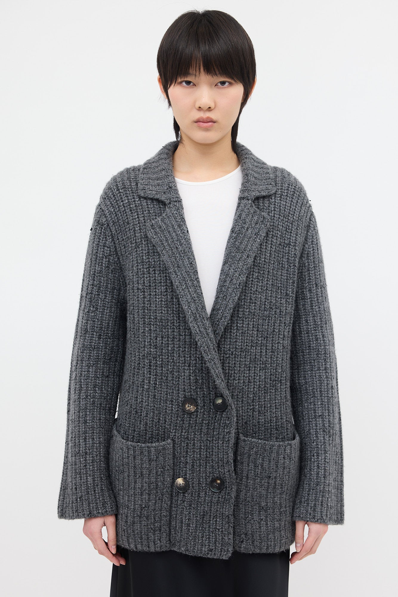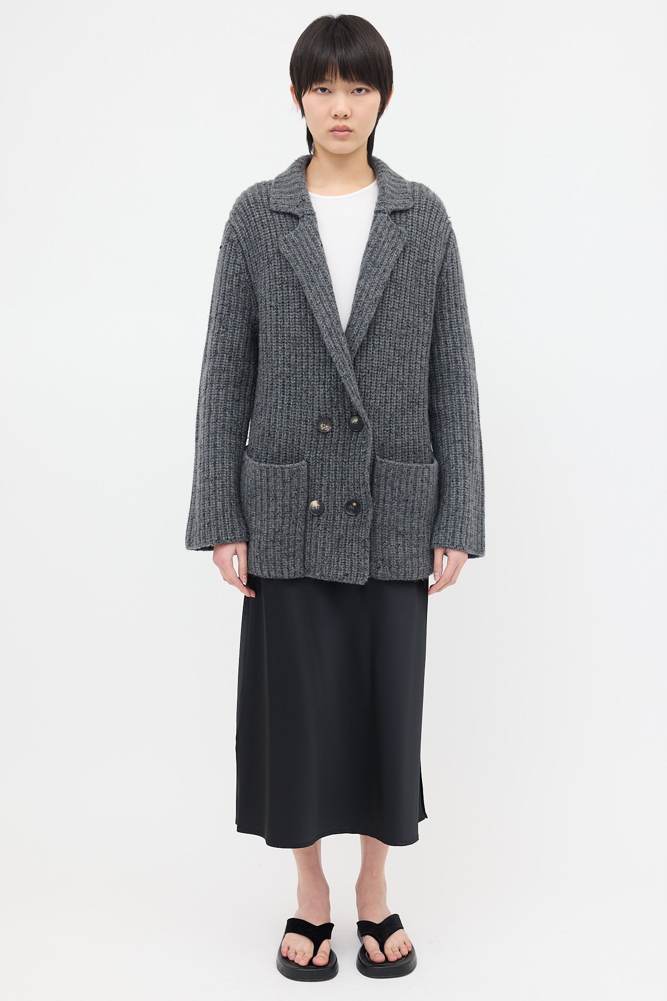 Pre-owned The Row dark grey cashmere Data cardigan featuring a notched lapel, double breasted button front, two patch pockets at front, and oversized silhouette.