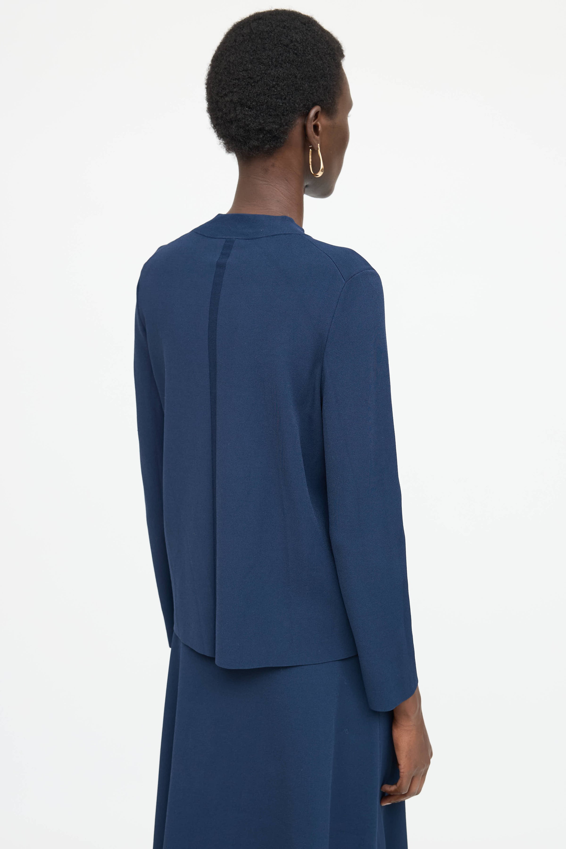 Pre-owned The Row navy knit top featuring a mock neck collar, long sleeves, and woven stripe at back. Matching skirt features an elastic ribbed waist, and minimal styling.