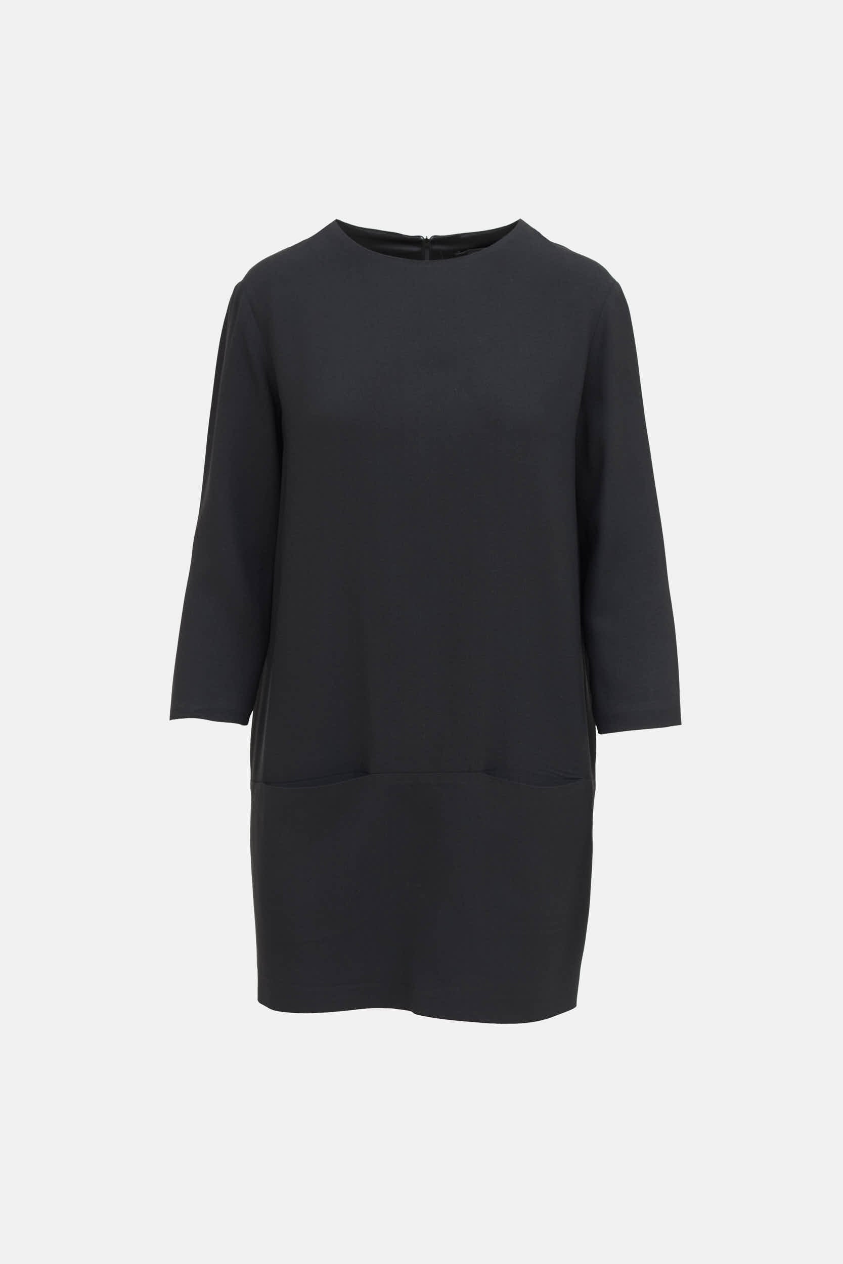 Pre-owned The Row black Marina dress featuring a round neckline, long sleeves, two slip pockets at front, and zip closure at back. Lined.