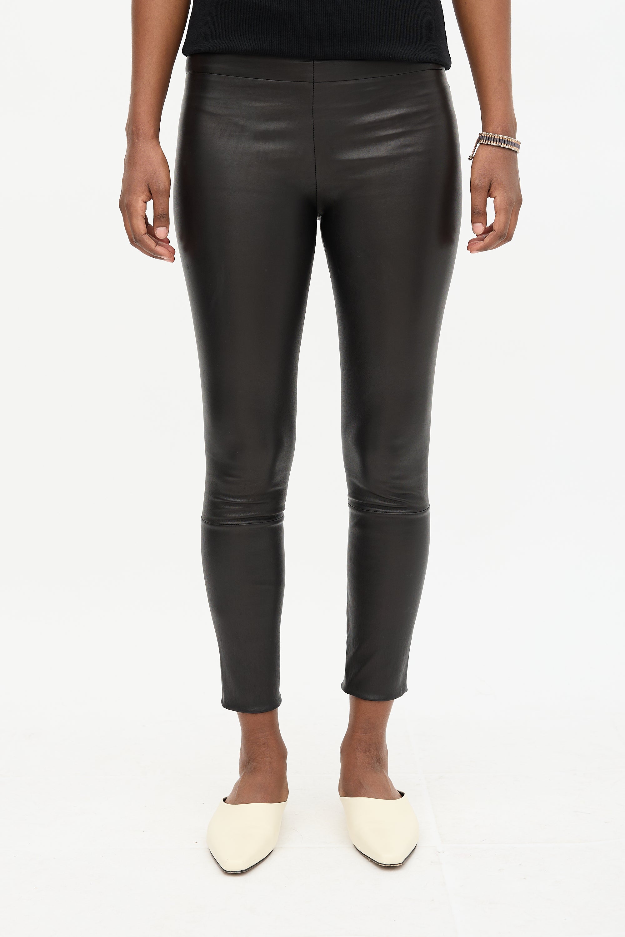 Pre-owned The Row black stretch Moto leather leggings featuring mid rise, elasticized waist, and zipped hem.