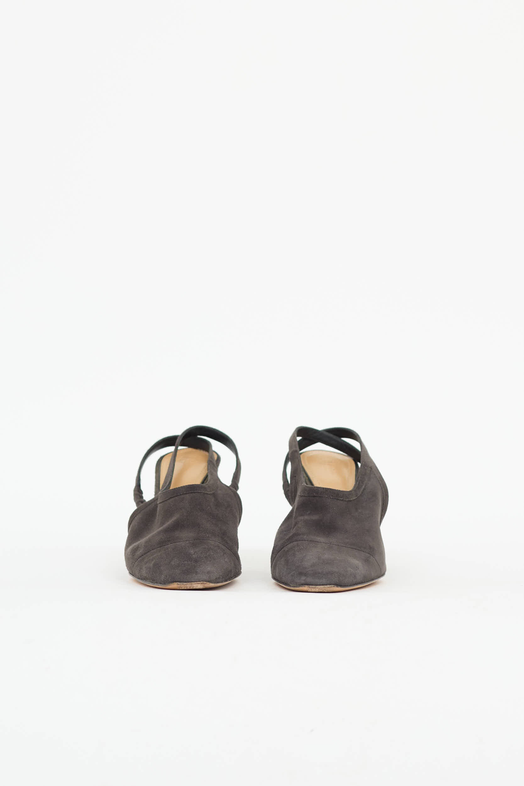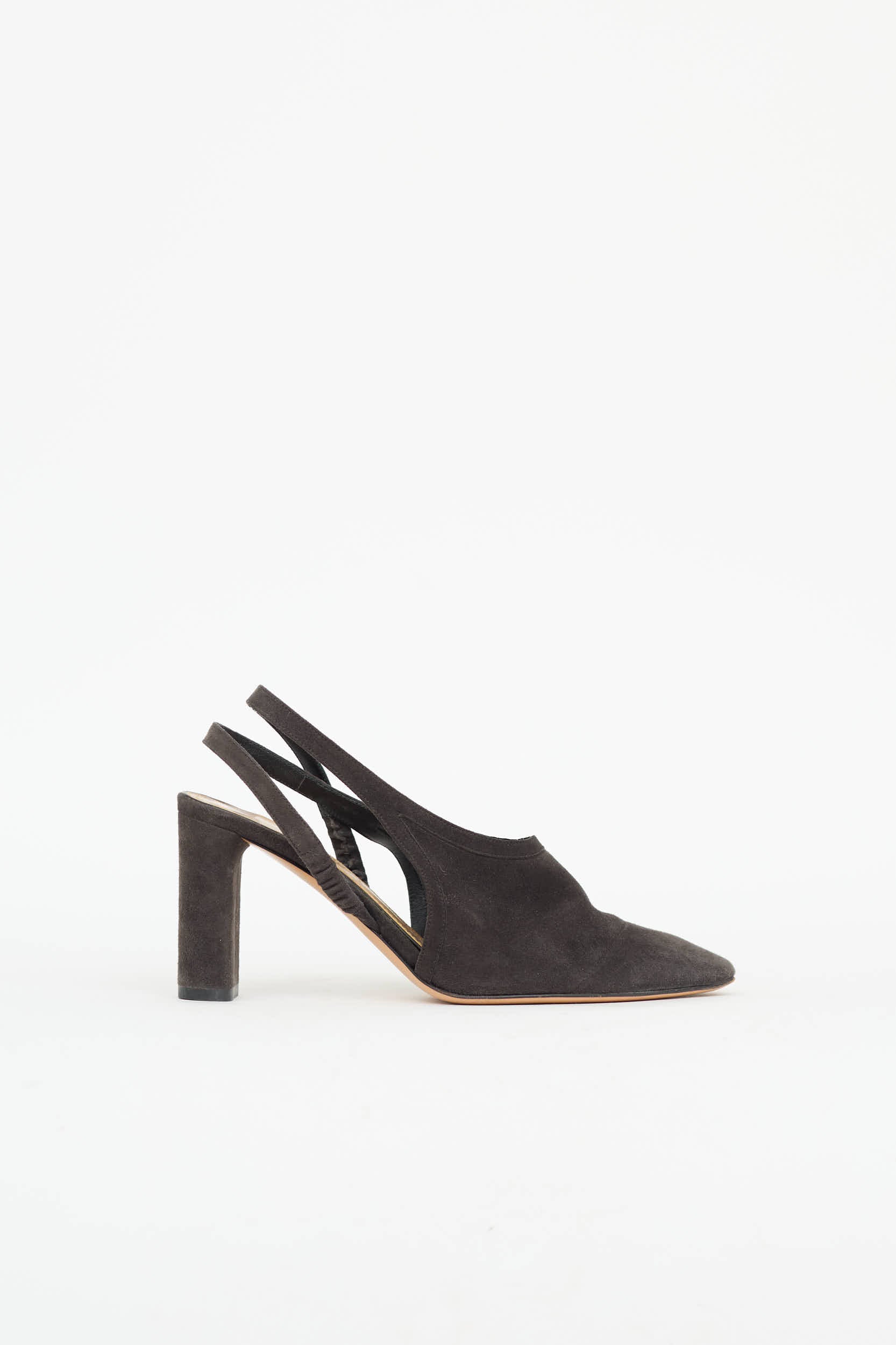 Pre-owned The Row grey Camil slingback pump featuring a pointed toe, suede upper, dual elasticized slingback straps, leather insoles, and a wrapped block heel.