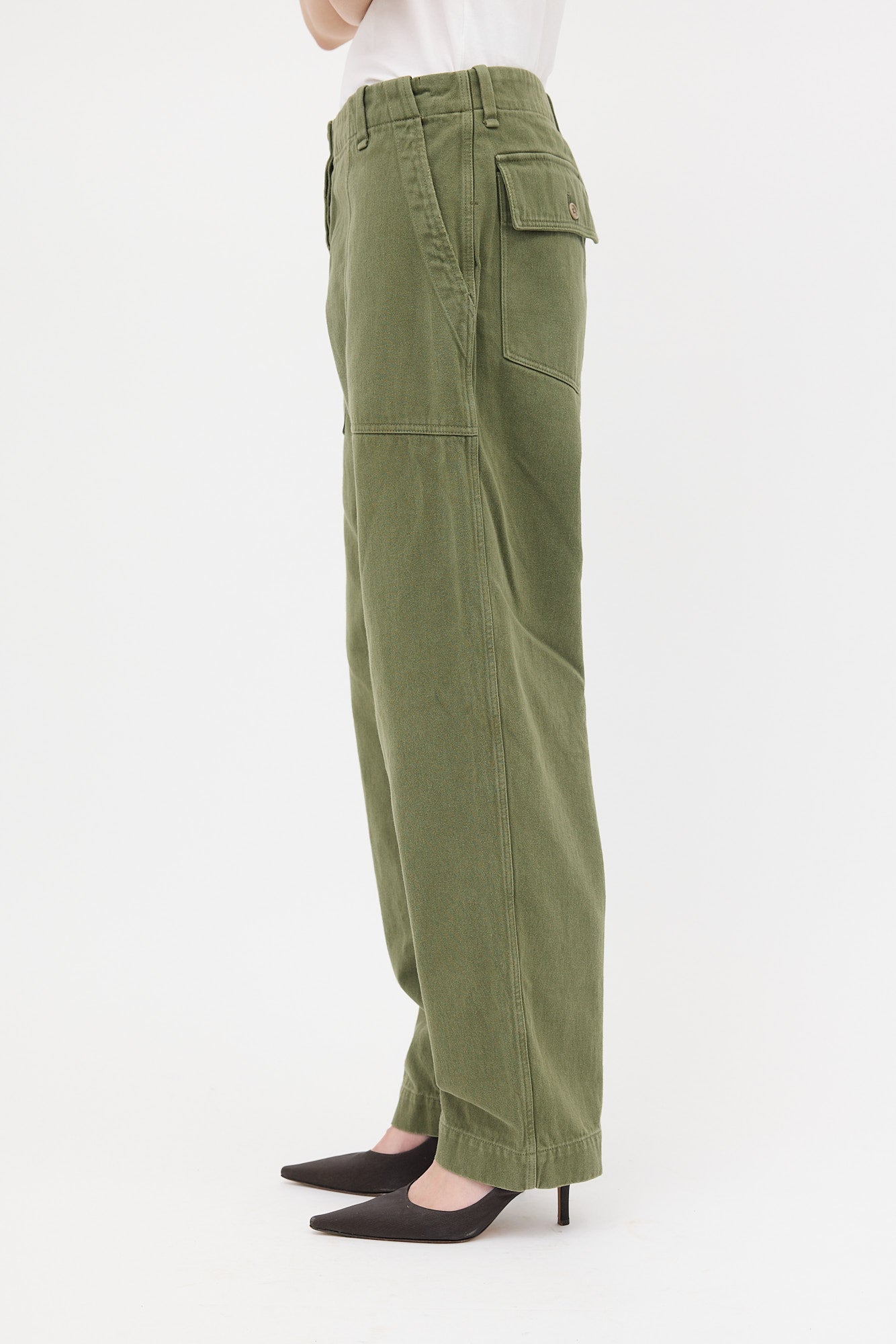 Pre-owned The Row green Vendula cargo pants featuring a button fly, belt loops, four pocket styling, and a tapered leg.
