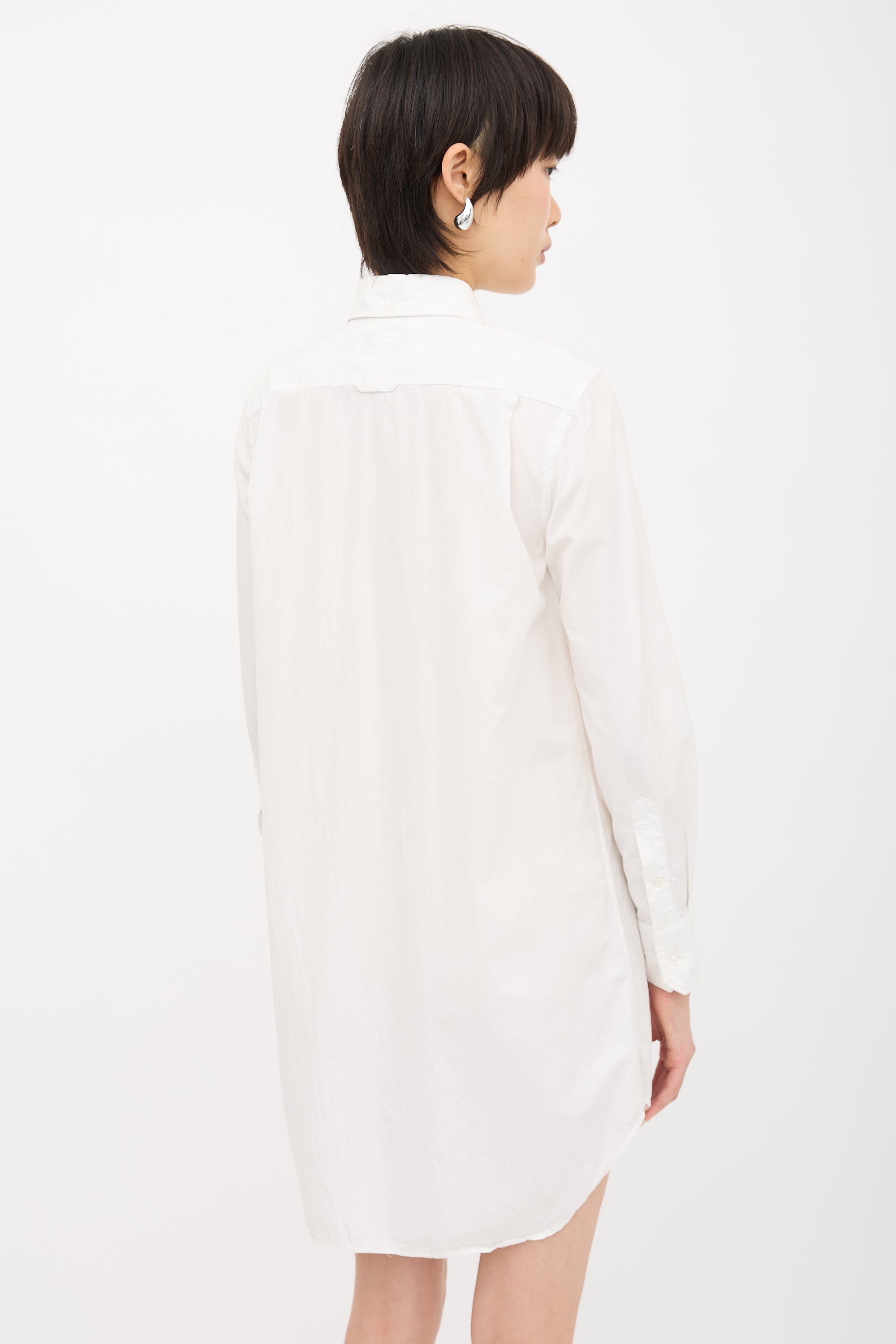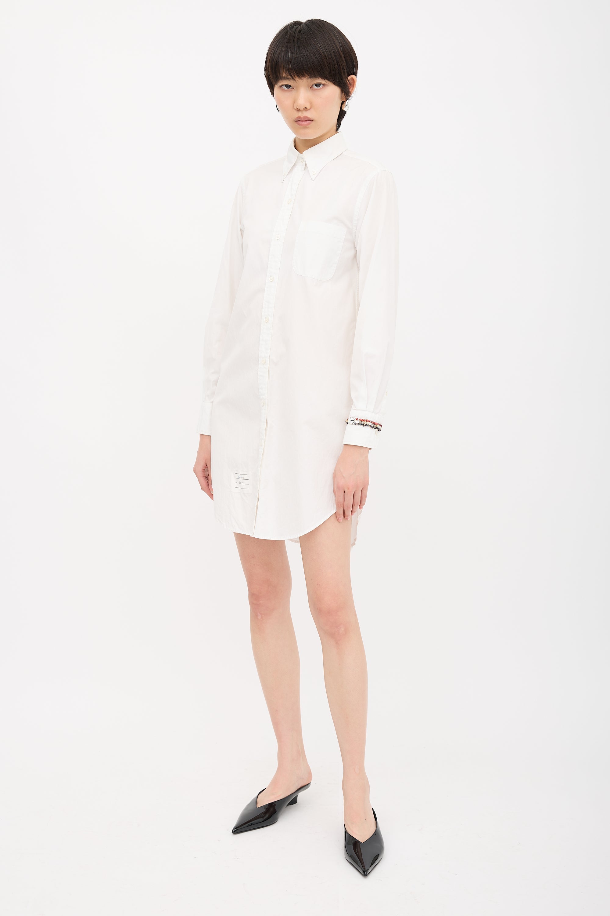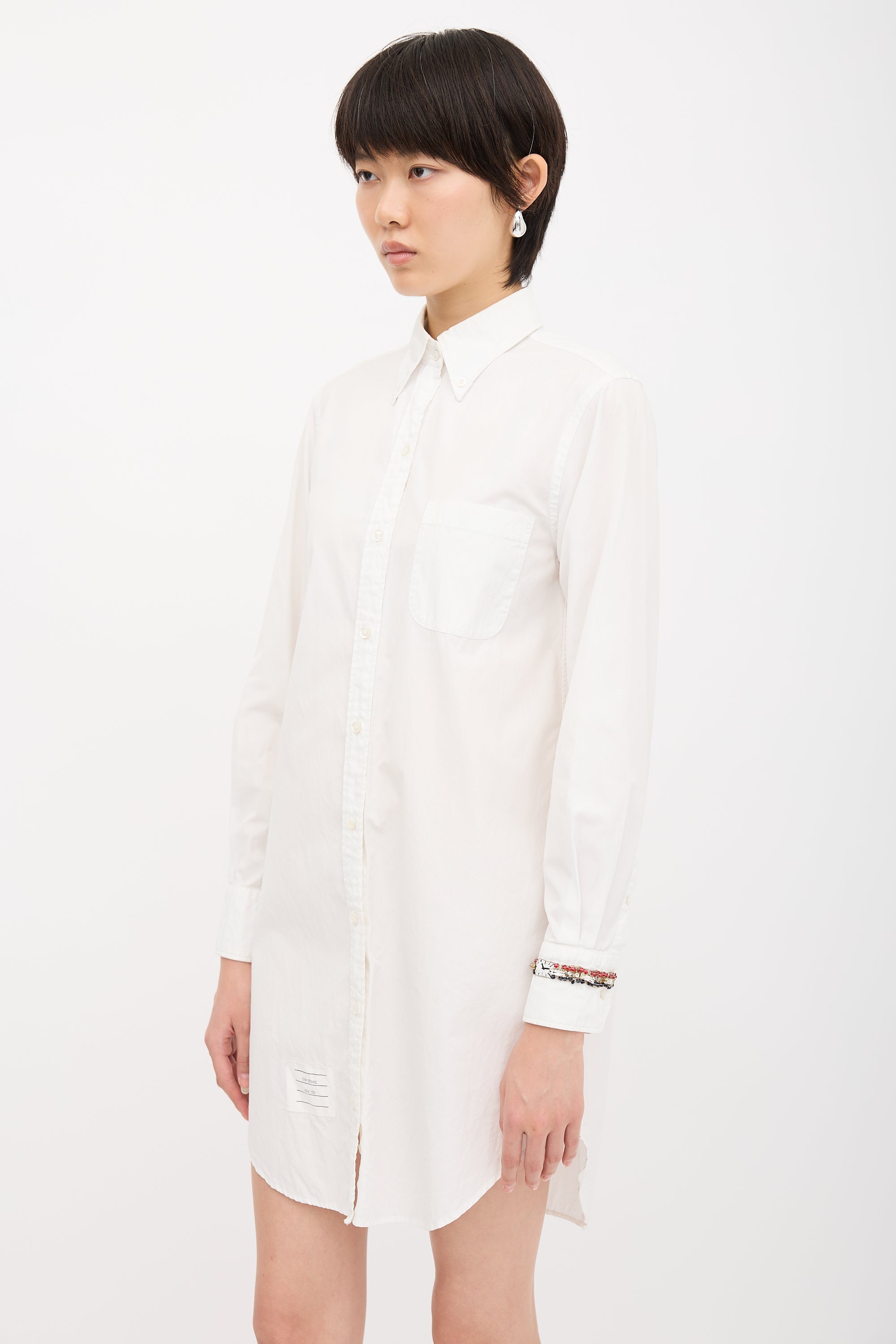 Pre-owned Thom Browne white dress featuring a spread collar, button front, patch pocket, brand label at hem, and multicolour watch embellishment at left cuff.