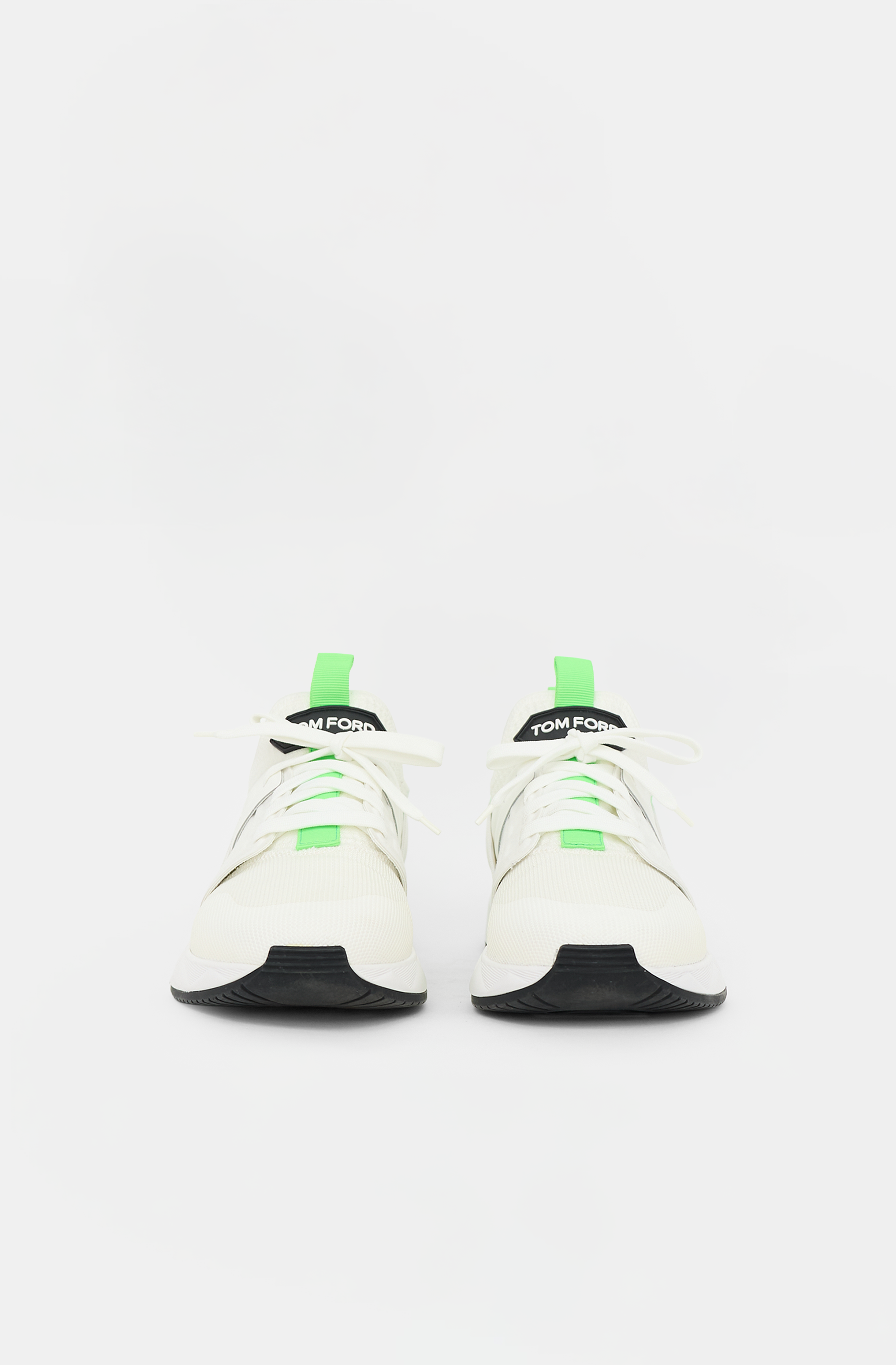 Pre-owned Tom Ford white and neon green Jago sneaker featuring a rounded toe, mixed mesh and neoprene uppers, lace up front with suede panel, rubberized logo at tongue, two pulls tabs at collar, and rubber sole. Comes with original dust bag and box.