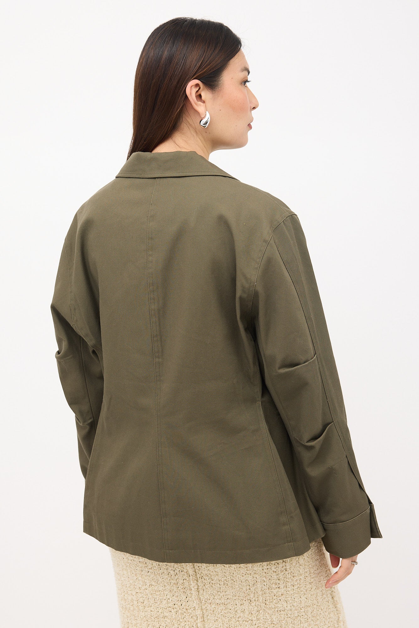 Pre-owned Toteme green khaki Army jacket featuring a notched lapel, concealed button front, four flap pockets at front, pleated elbow detail, and buttoned cuffs. Lined.