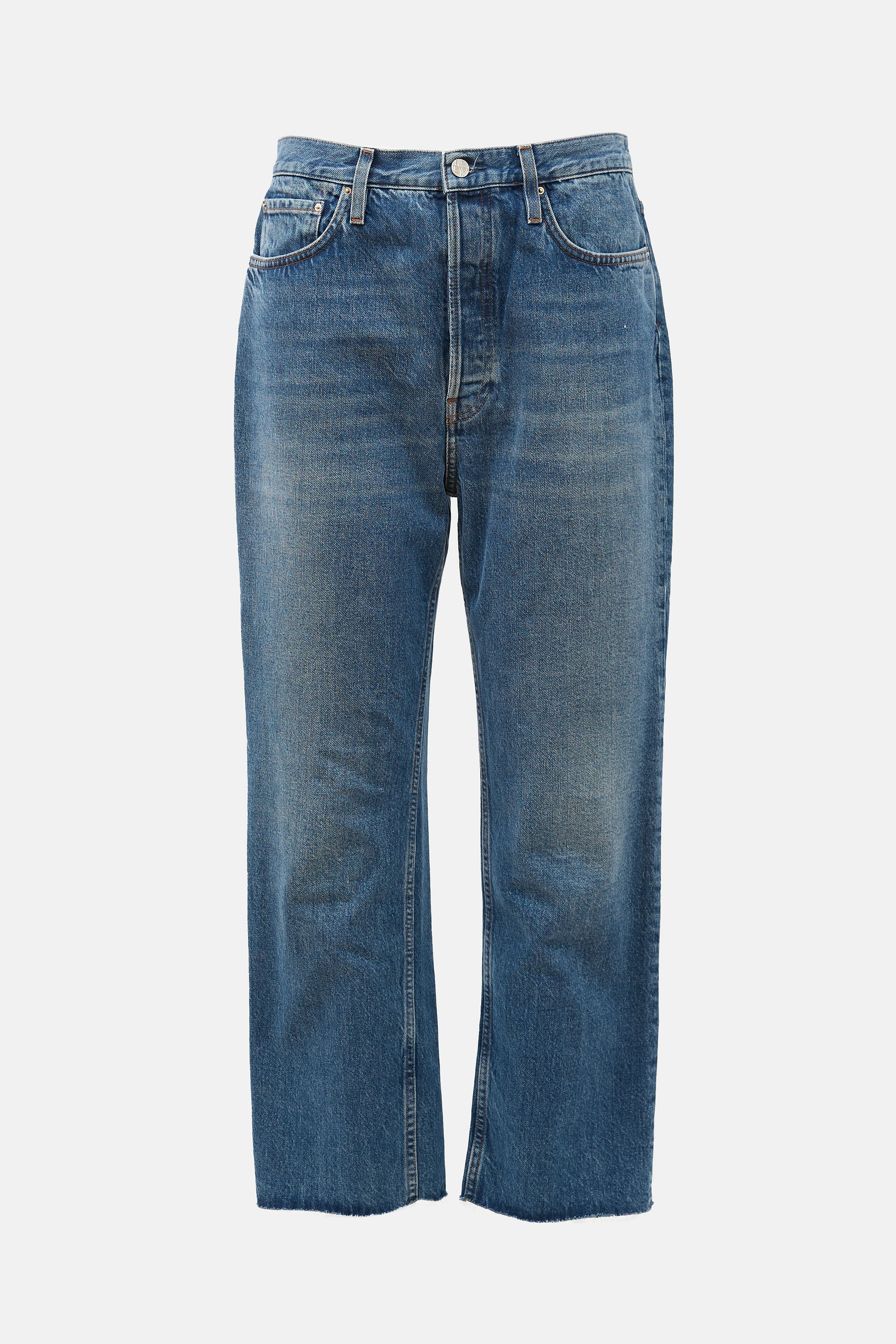 Pre-owned Toteme mid wash Classic Cut jeans featuring a high rise, button fly, five pocket styling, straight leg, and raw hems.