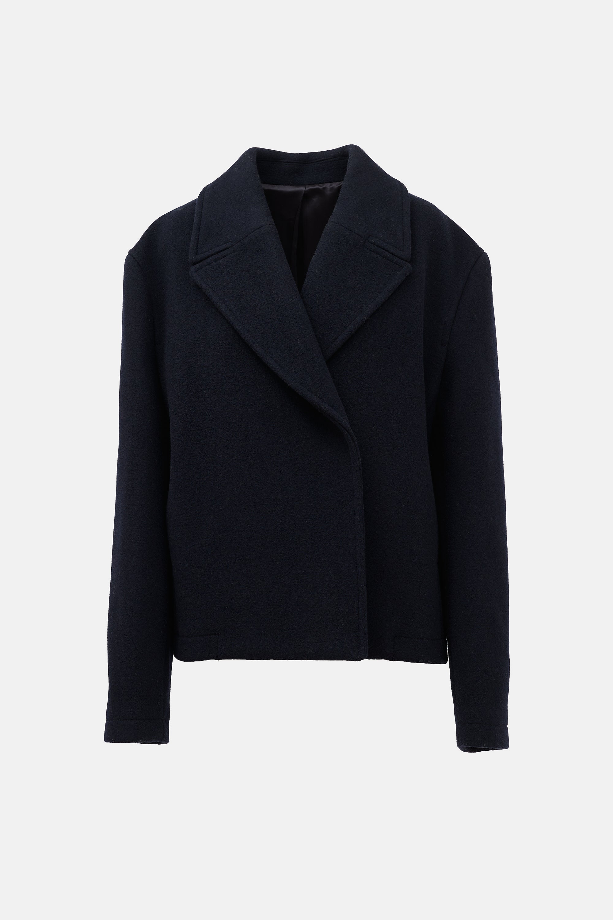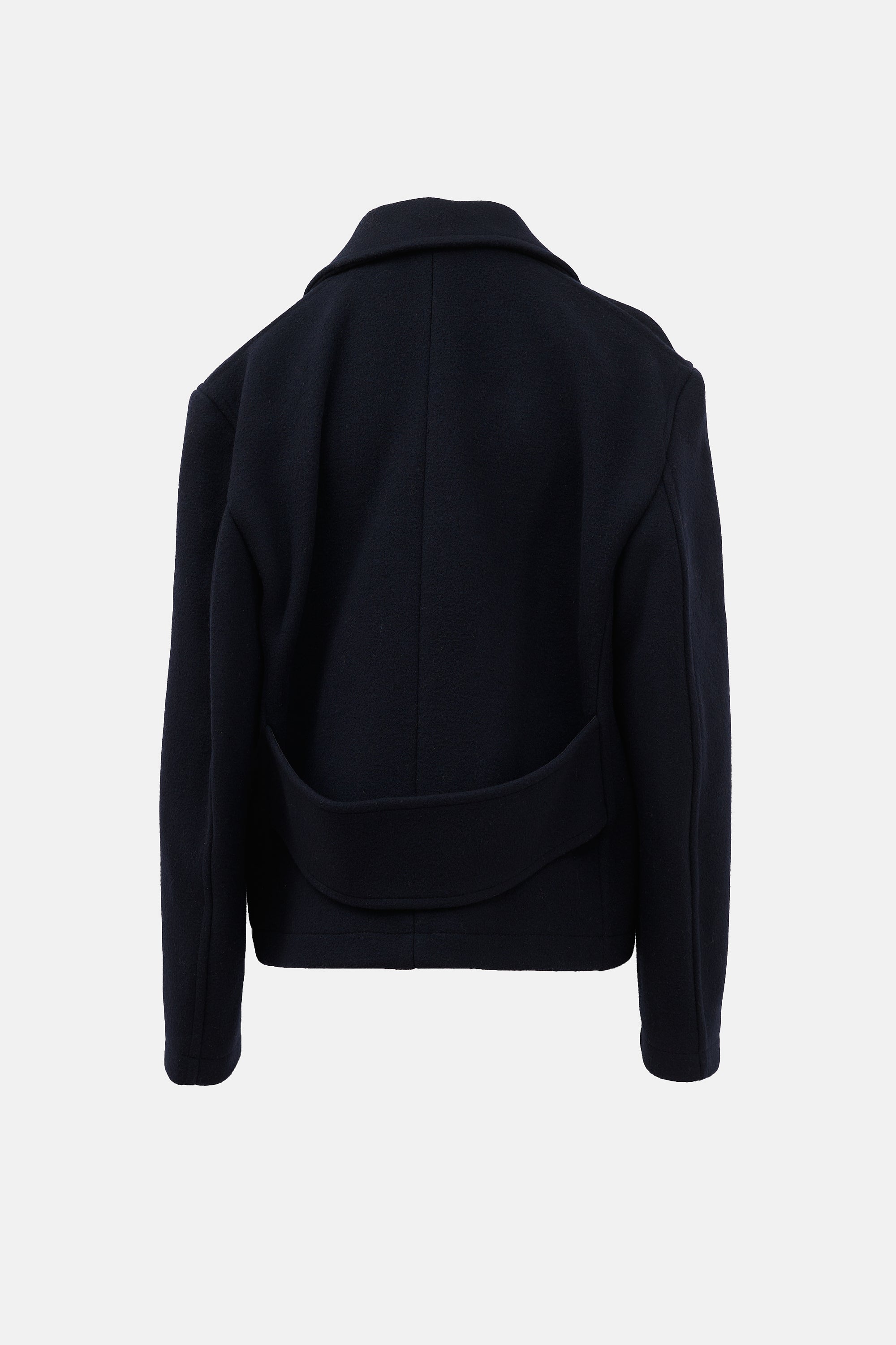 Pre-owned Toteme navy wool Cropped Peacoat featuring a notched lapel, concealed crossover button front, two inseam pockets, and a belted back waist. Lined.