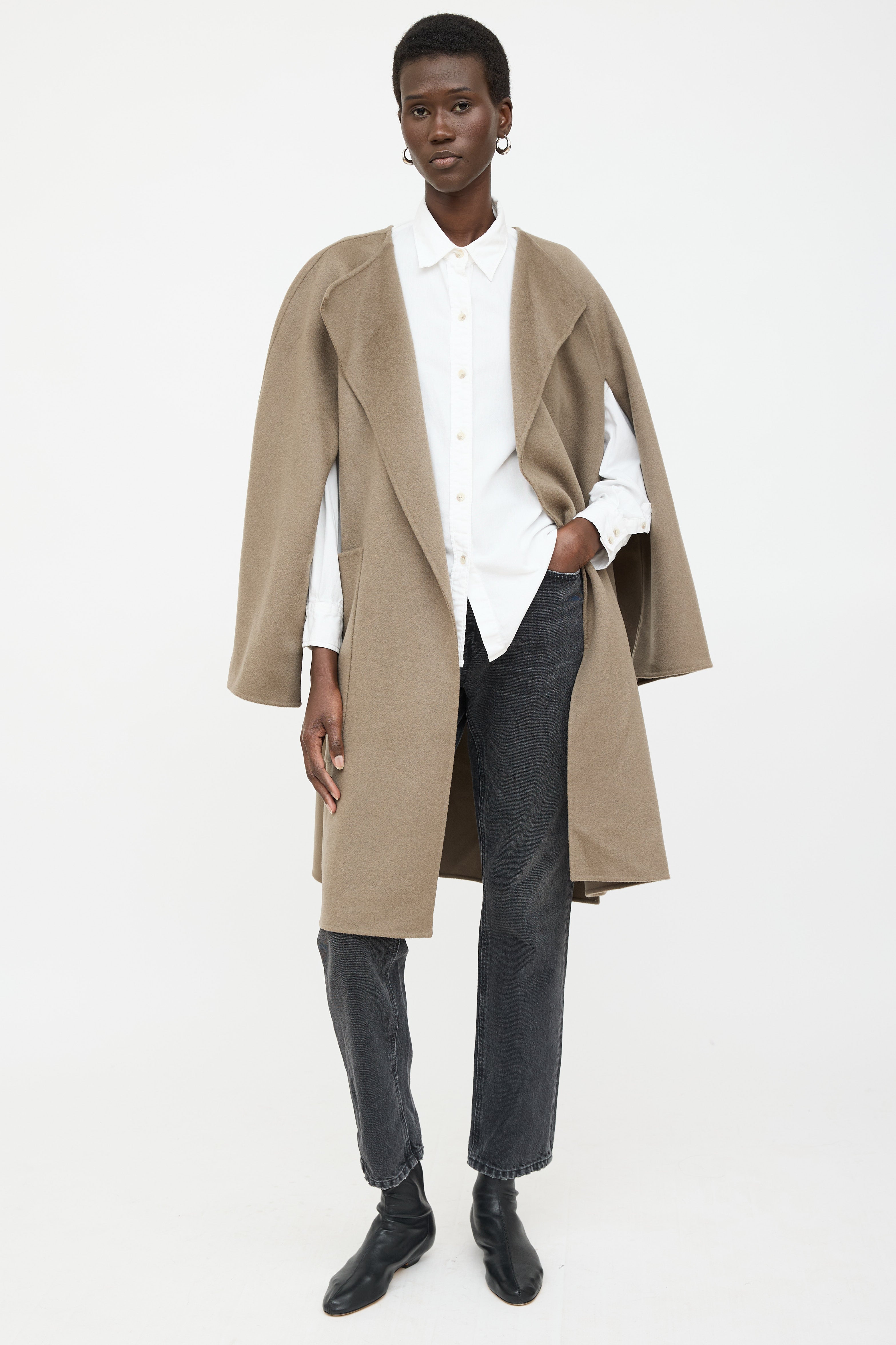Toteme green Doublé Cape wool coat featuring a pointed collar, long raglan sleeves with under arm slits, two patch pockets at hip, slits at hem, and open front.