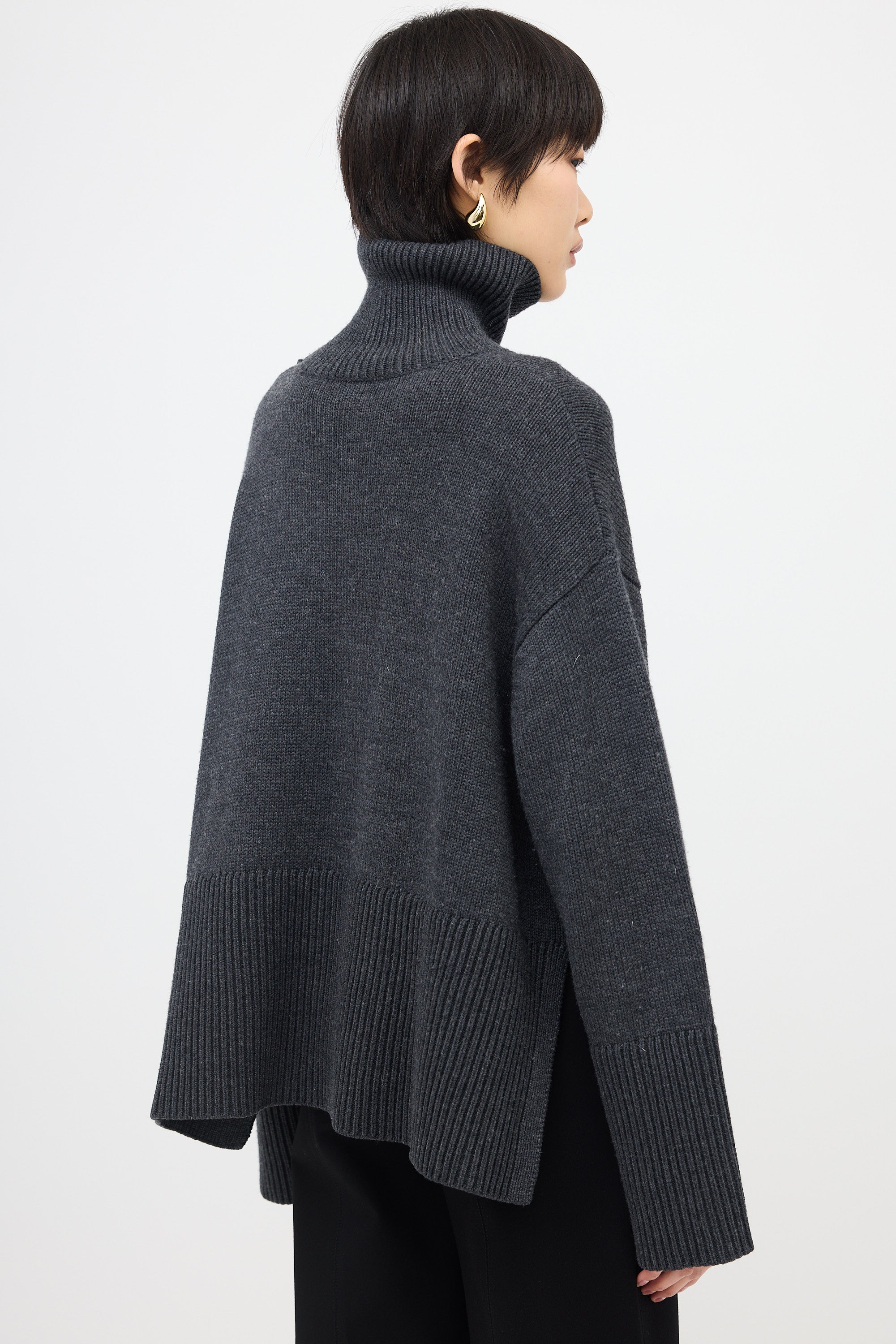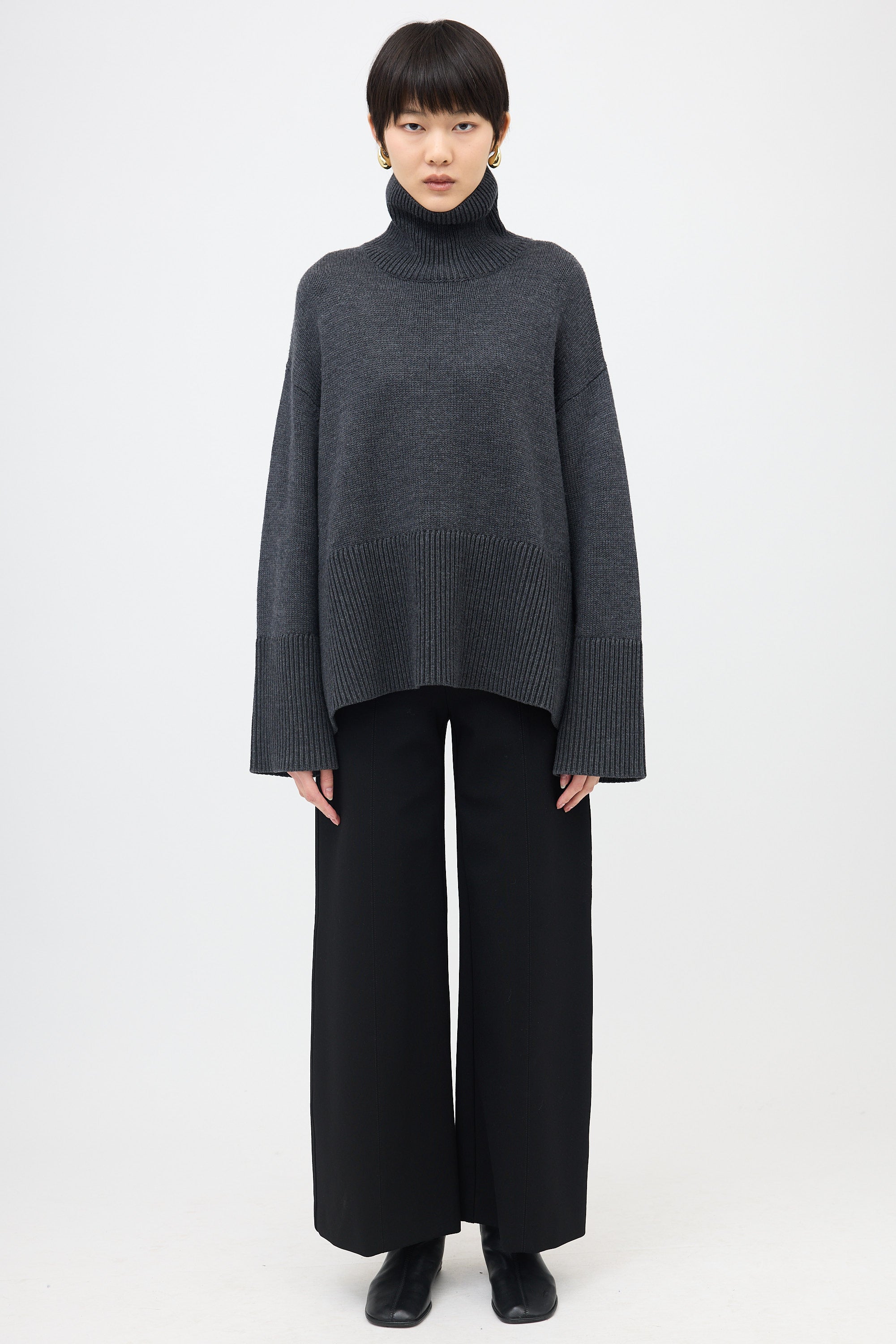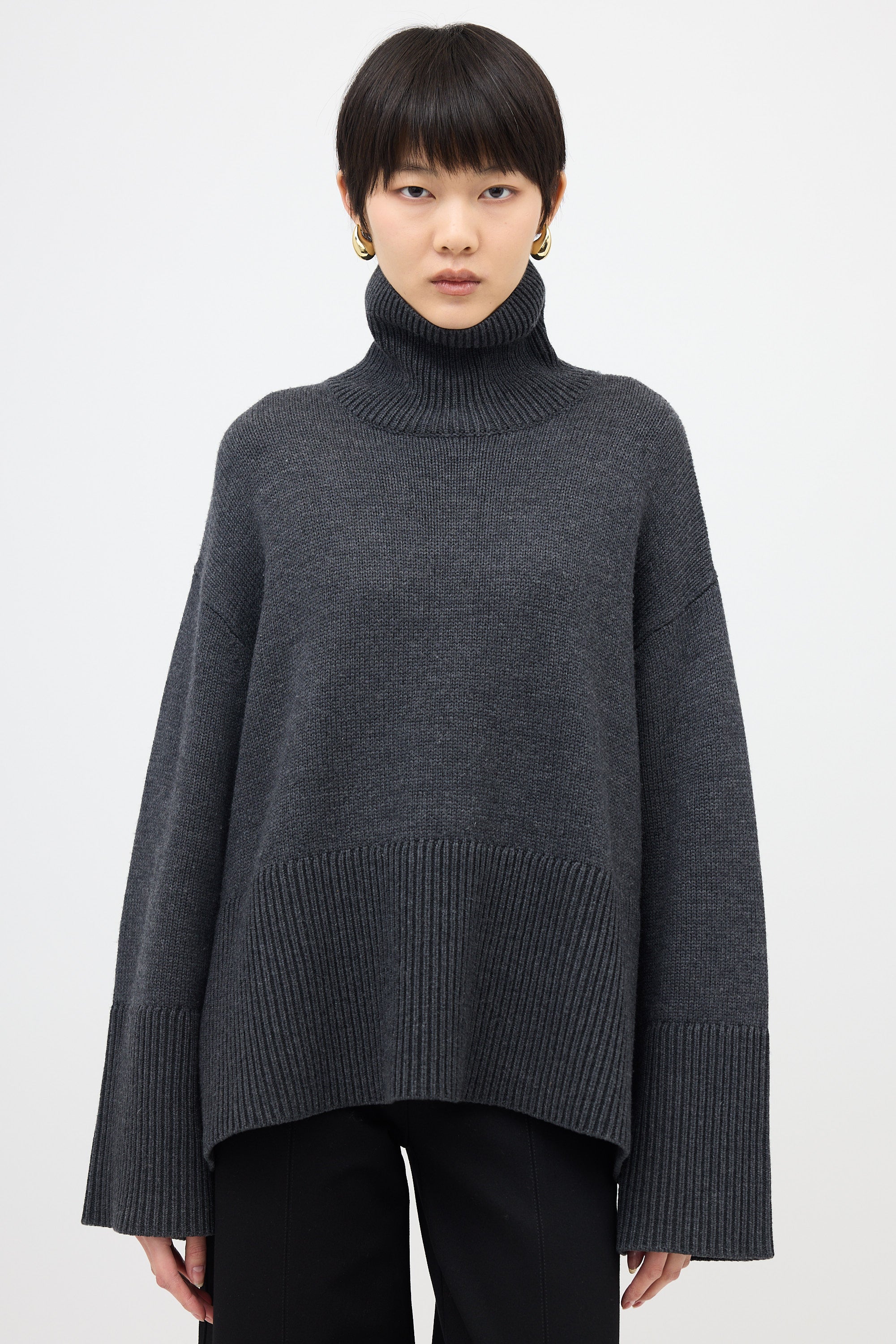 Pre-owned Toteme grey wool blend sweater featuring a turtle neckline, ribbed trim, side vents, and oversized fit.