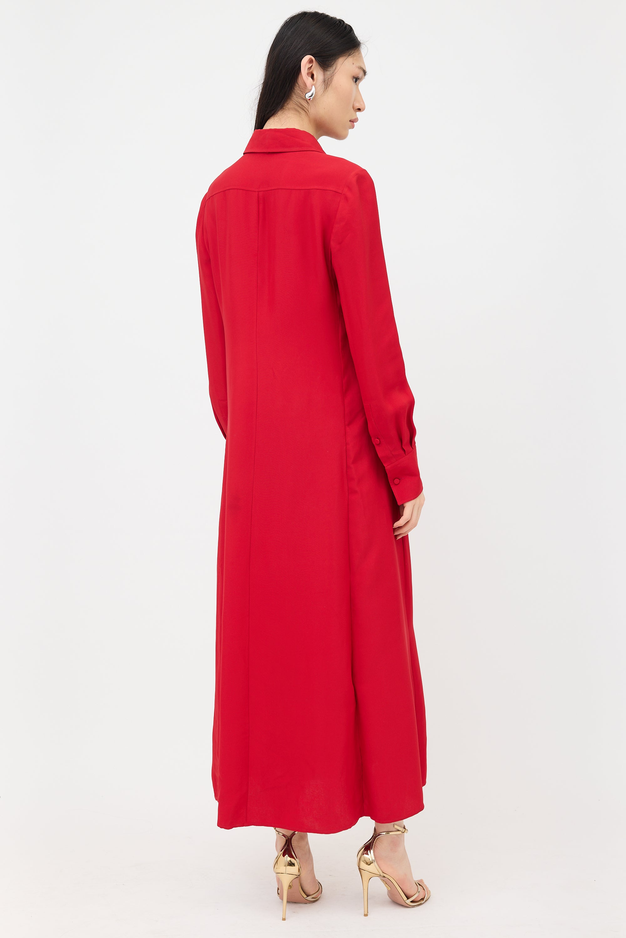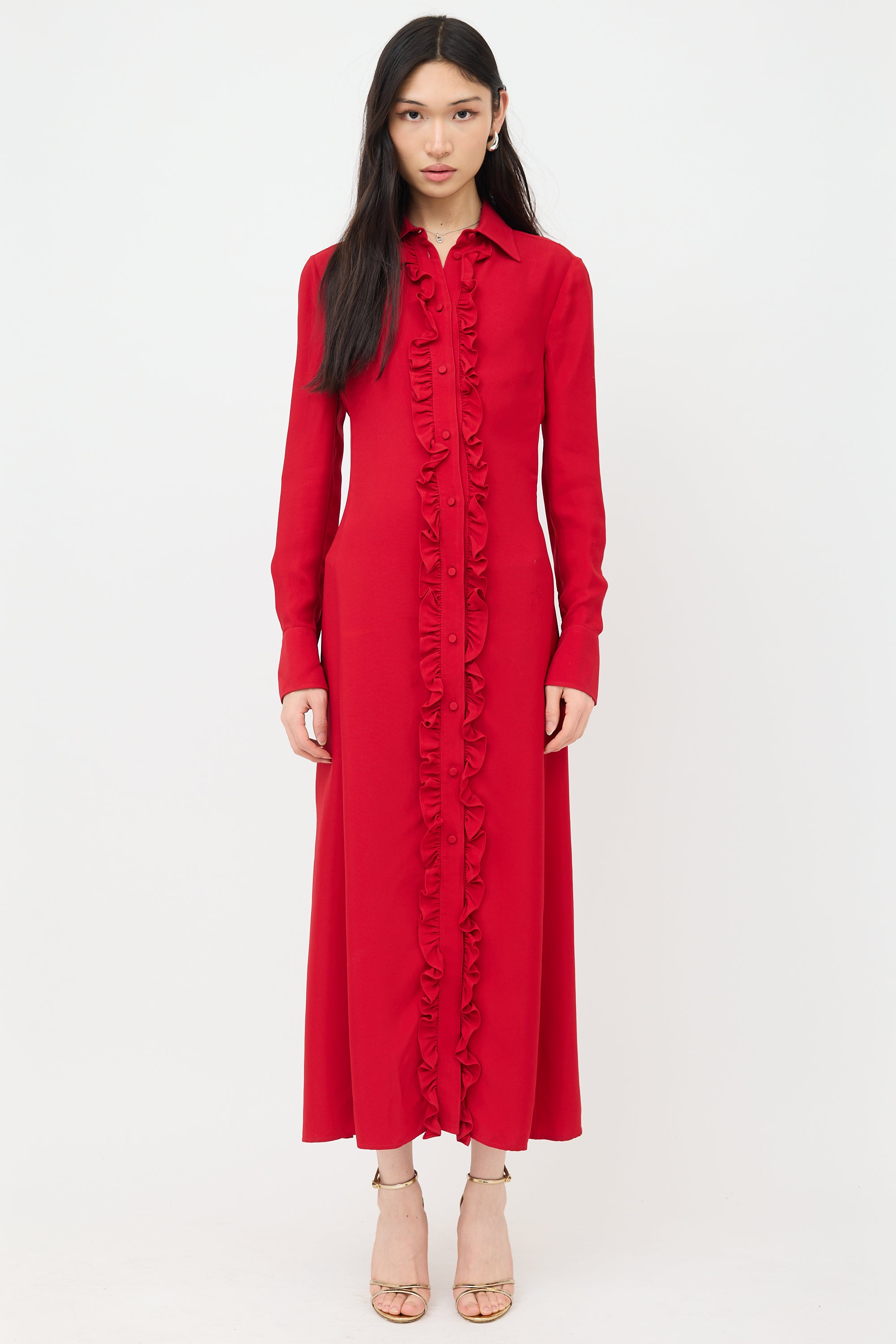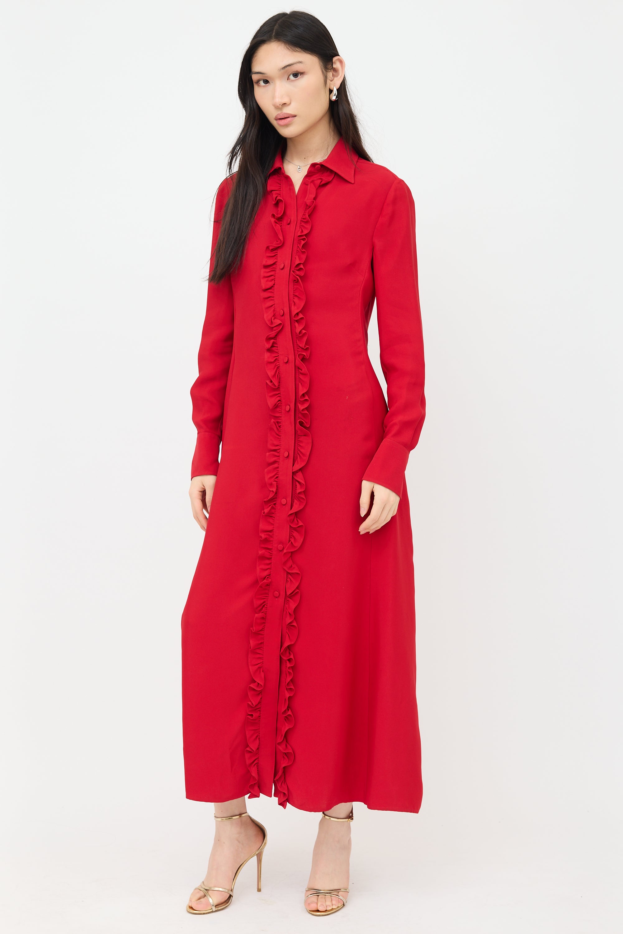 Pre-owned Valentino red satin dress featuring ruffled placket, button front, classic collar, and long sleeves with buttoned cuffs.