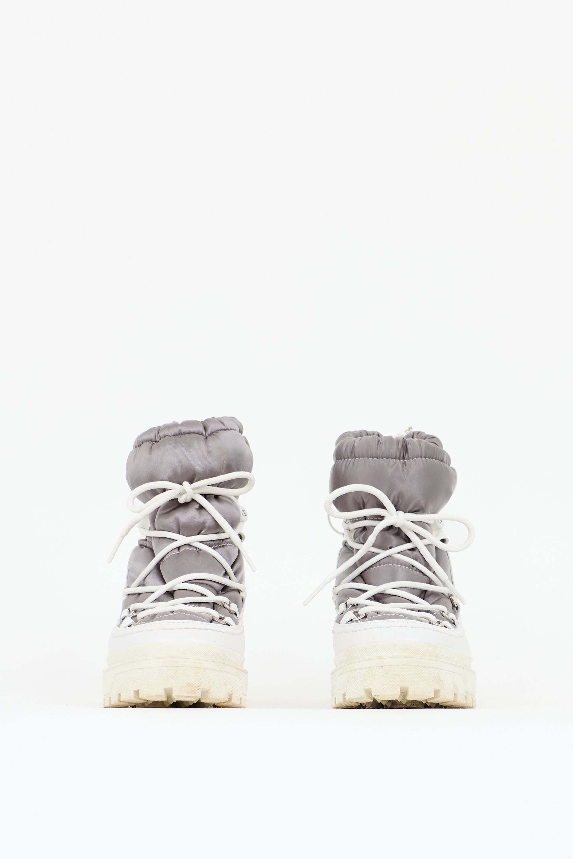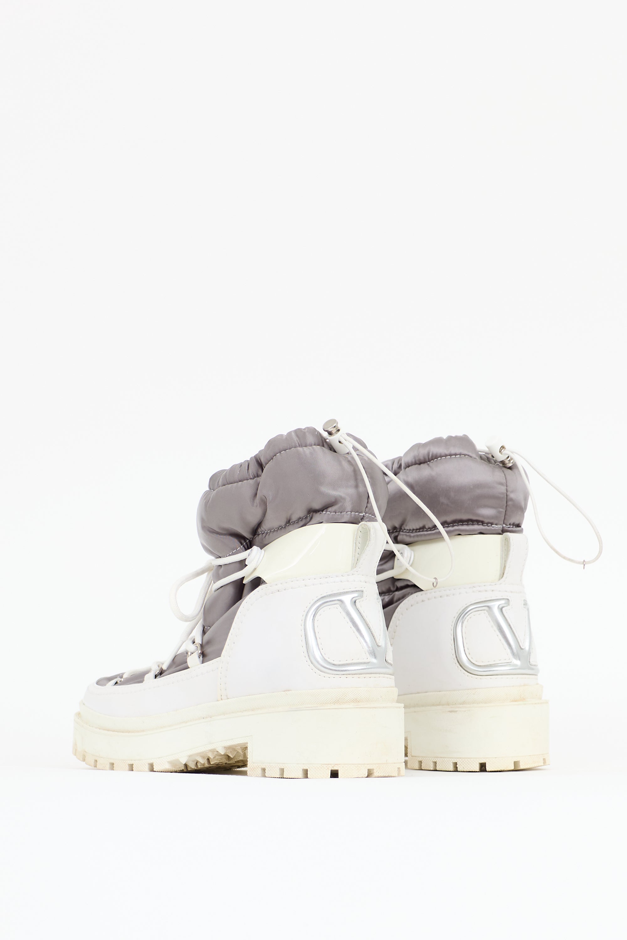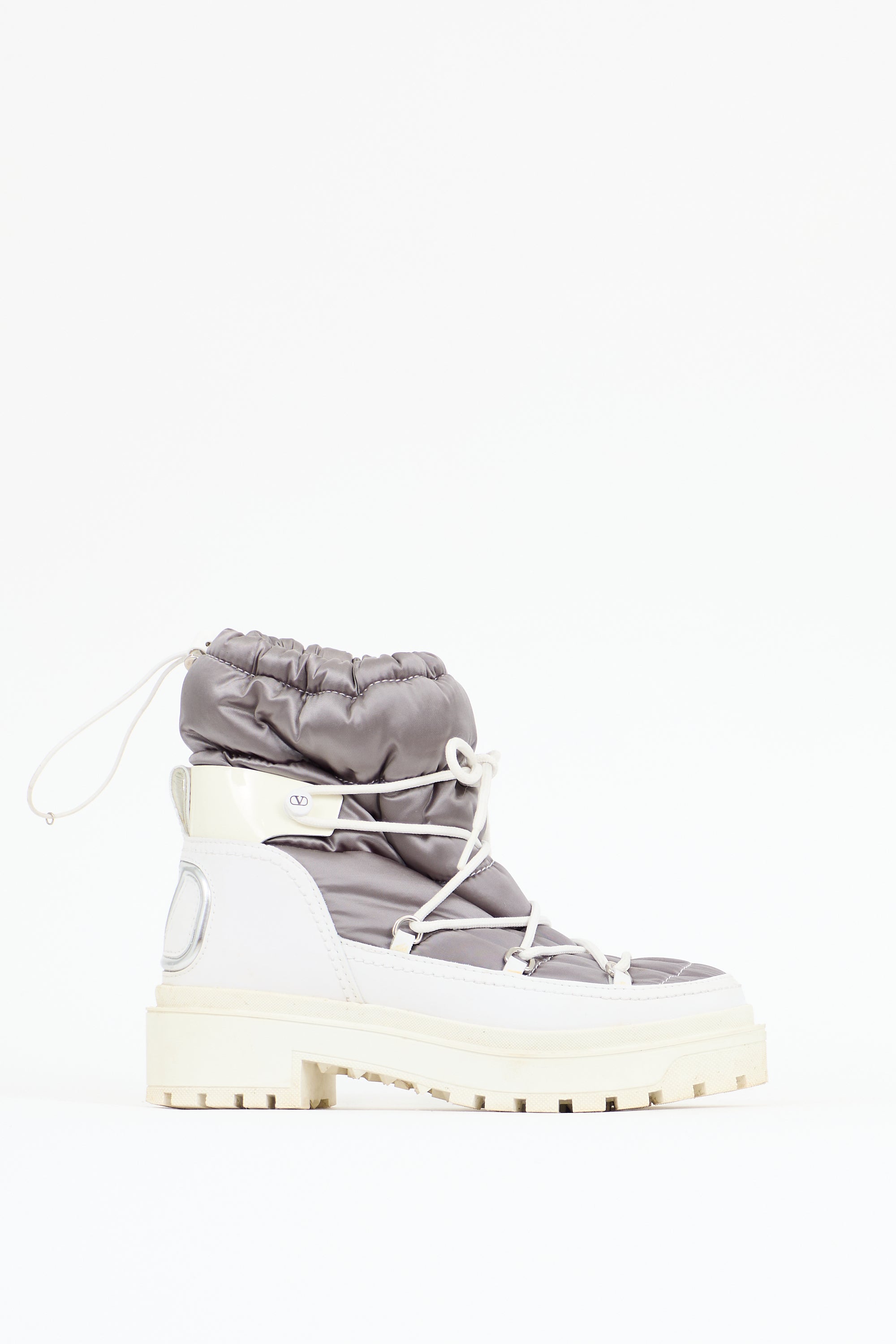 Pre-owned Valentino white and grey Trekkgirl puffer ankle boots featuring rounded toe, lace up front, drawcord topline, pull tab and silver tone logo at counter, and white treaded rubber sole.