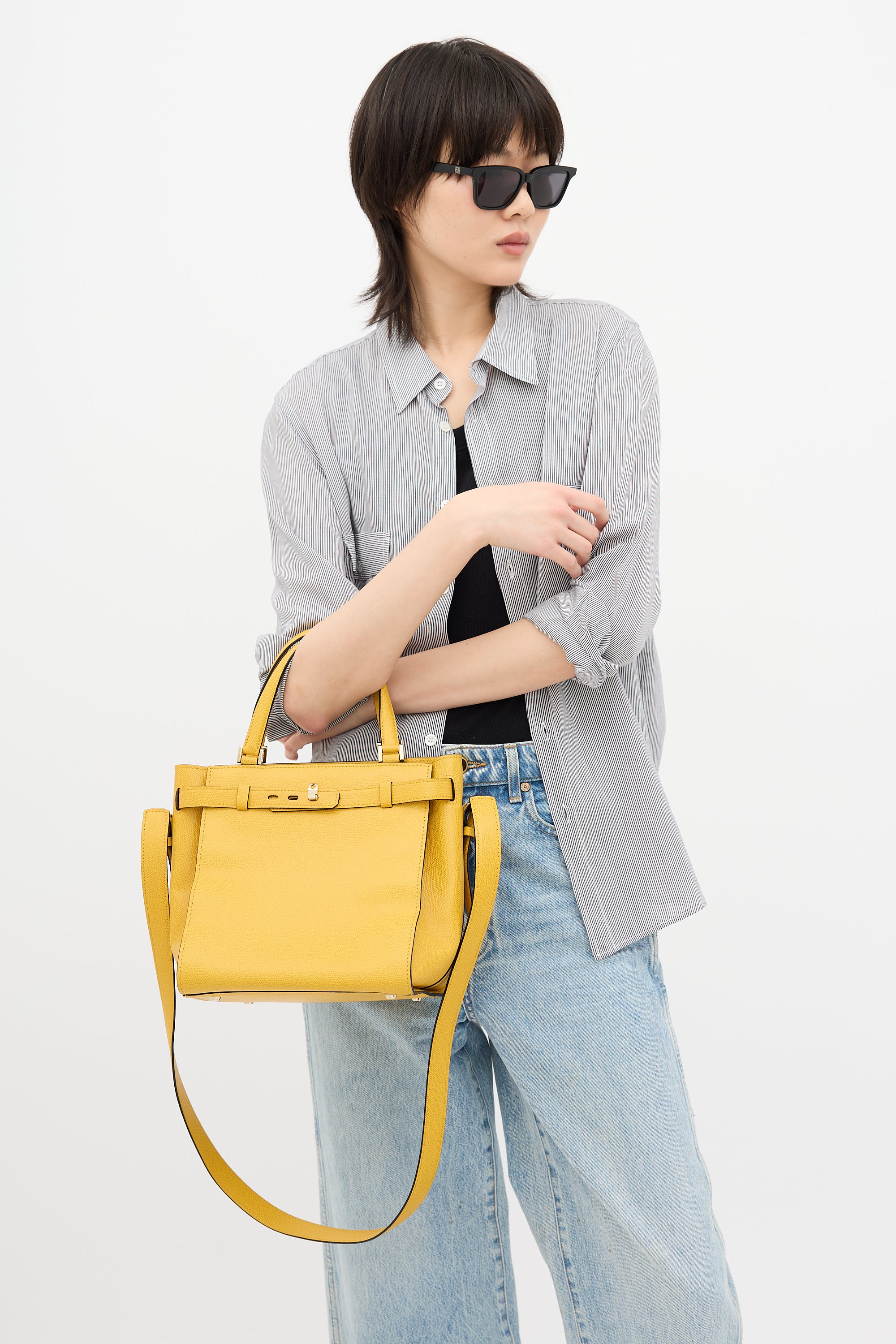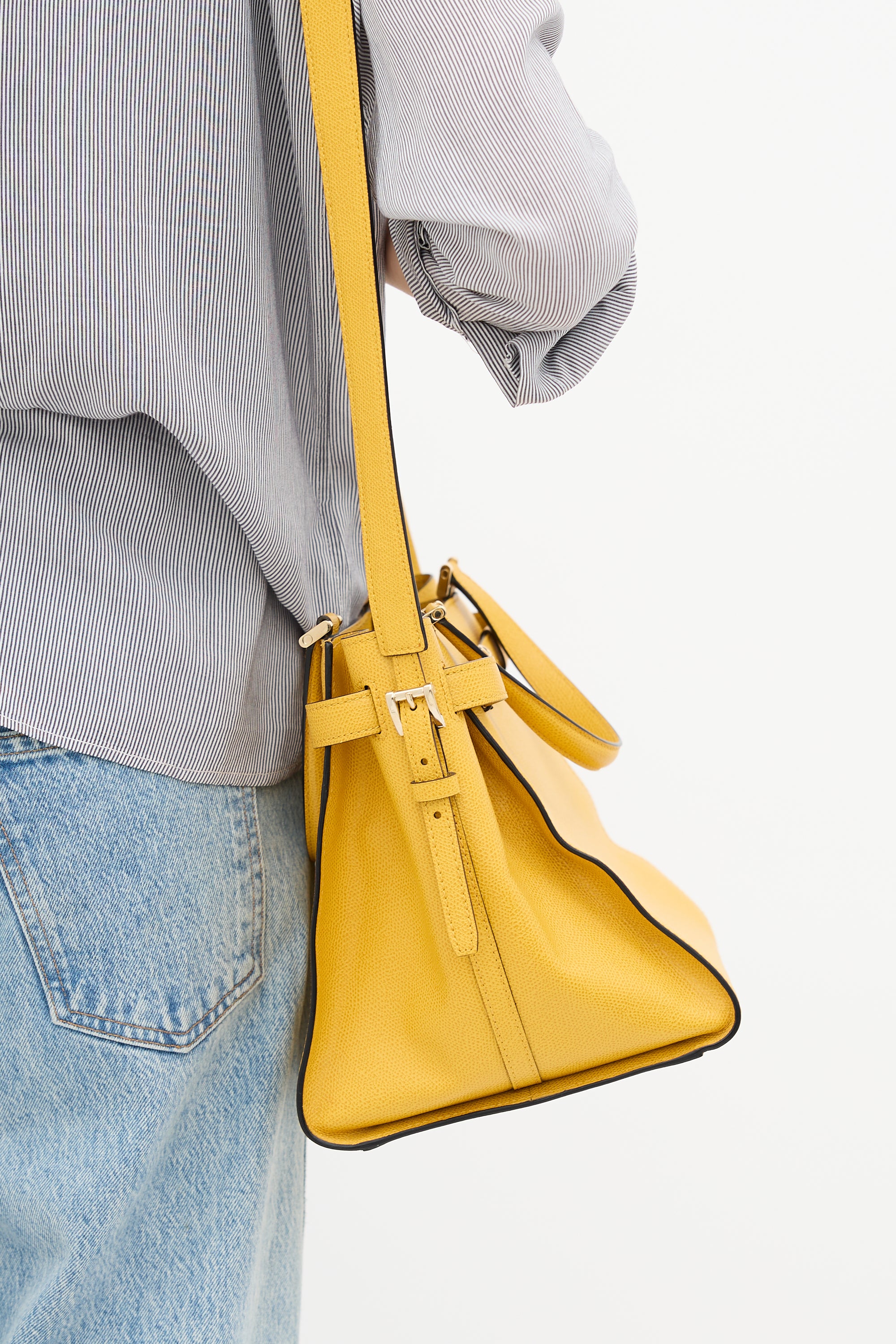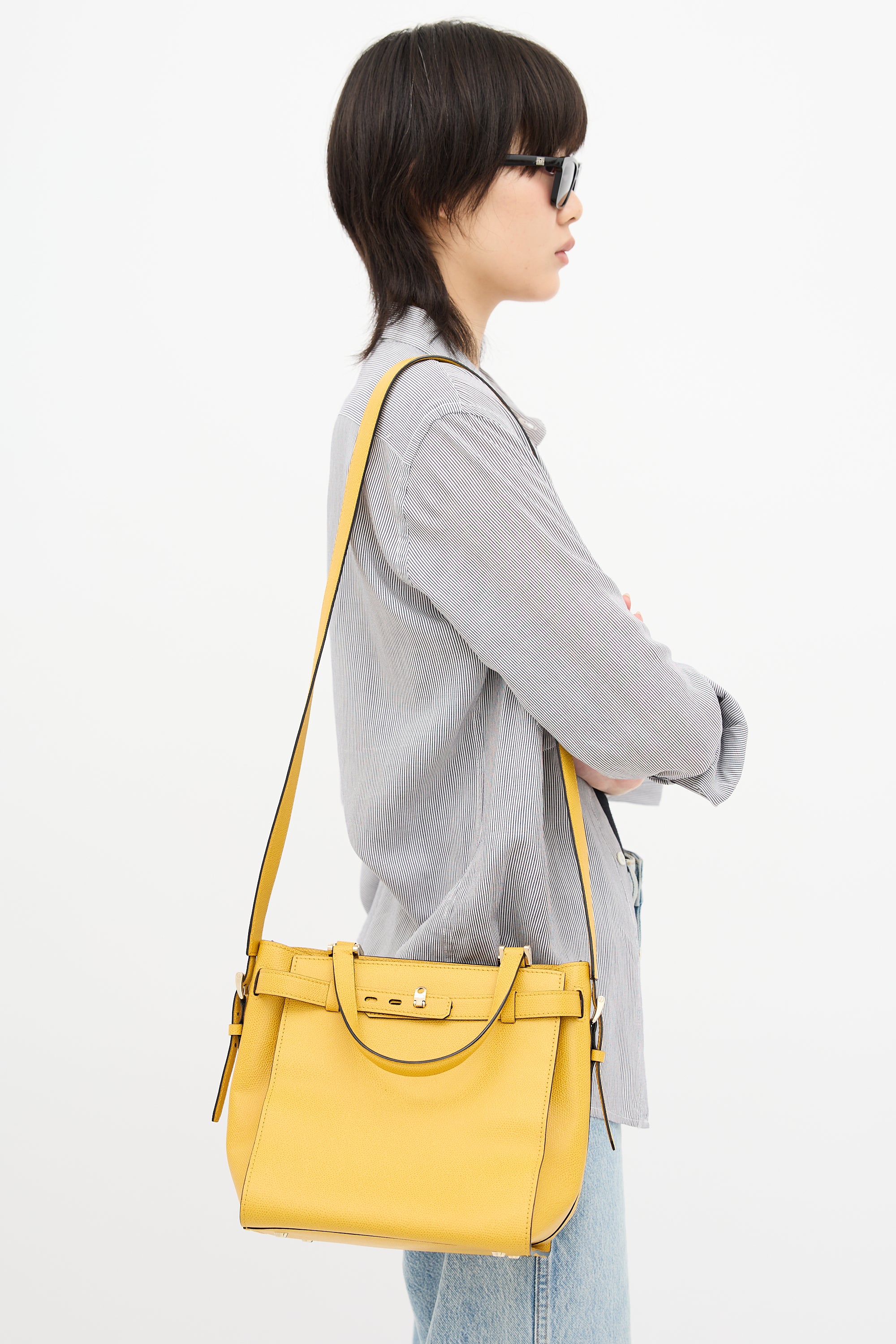 Pre-owned Valextra yellow textured leather B-Cube bag featuring tonal stitching, silver tone hardware, four feet, dual flat top handles, removable and adjustable shoulder strap, top belt detail, and one lined main compartment with two zip pockets. Comes with original dust bag.